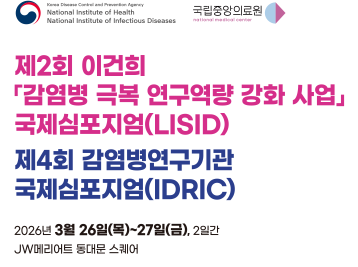 온라인 강연2026. 3. 26 09:00 오픈 홍보영상제1회 이건희「감염병 극복 연구역량 강화사업」국제심포지엄(LISID) 홍보영상제3회 감염병연구기관 국제심포지엄(IDRIC) 지난행사보기